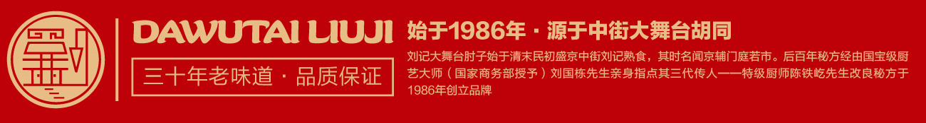 品牌創始人陳鐵屹先生自幼師承遼菜正宗,以發揚傳承遼味為己任。1986年,陳鐵屹先生經師傅指導調制出第一鍋醬湯,自此開始制作熟食,并于市井銷售,食客絡繹不絕。作為中華美食的傳承者、開拓者和創新者,陳鐵屹先生于80年代創立“劉記大舞臺肘子”品牌,開出了第一家門店?;诎倌昝胤絺鞒懈牧?,并采用新鮮放心原料,秘用二十幾味名貴藥材,延用傳統工藝專心加工而成,形成了色澤艷麗,酥爛脫骨,肥而不膩,瘦而不柴的風味產品。